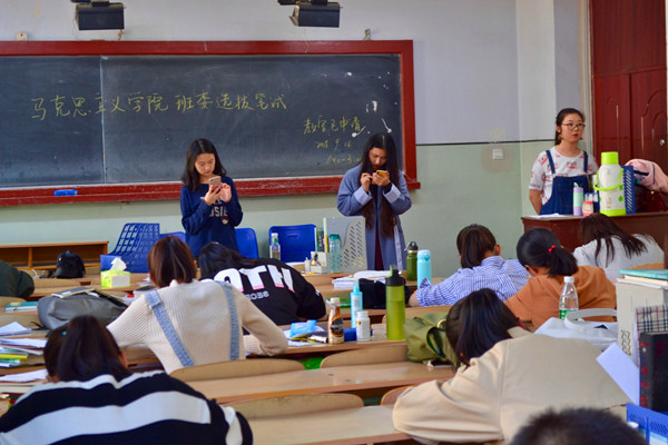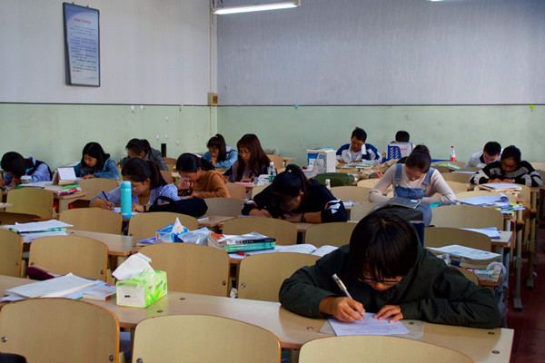 首先,应试的学生依次进入教室并进行签到。同学们全数到场后,杨旭静向同学们落实考试要求并组织分发试题。笔试过程中秩序井然,同学们专心致志答题,心无旁骛。笔试结束后,同学们有序离场。