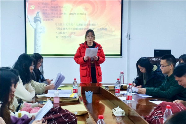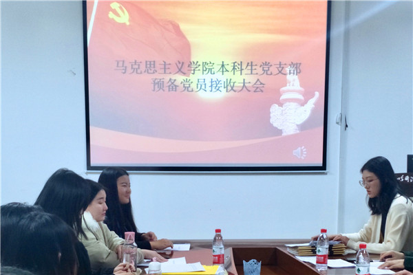 大会伊始,邹晓蕾清点到会人数并组织奏唱国歌,并介绍党员发展流程、本次支部会议议程,以及发展对象的基本情况。随后,此次即将被组织吸收为预备党员的5名发展对象依次就对党的认识、入党动机、本人履历、家庭和主要社会关系等情况,向支部进行了汇报。本次转正的9名预备党员分别汇报了预备期内的综合表现。