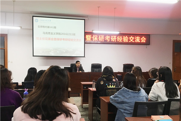 第二个环节为保研考研经验交流会。首先,陈敏行上台发言,他以专业第一名的成绩保研至北京师范大学。陈敏行介绍了2014、2015级同学的升学情况及学院保研政策,并与大家分享了自己参加夏令营的经验体会。接着,申嘉杨从择校、专业选择、资料购买、复习规划四个方面分享自己的考研经验。她以初试第一名的成绩进入复试,成功考入南开大学。最后,申嘉杨就同学们提出的考研相关问题给出自己的建议,并向同学们推荐了一些考研资料获取途径。
