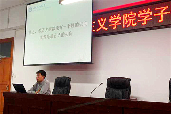 5月14日下午6点30分,由校学生会生活权益部主办、四海资讯导航官网学生会生活权益部承办的学子论坛于主楼420教室如期举行。2015级优秀学生代表陈敏行、申嘉扬担任主讲,辅导员张学超出席,2017、2018级全体本科生参加。